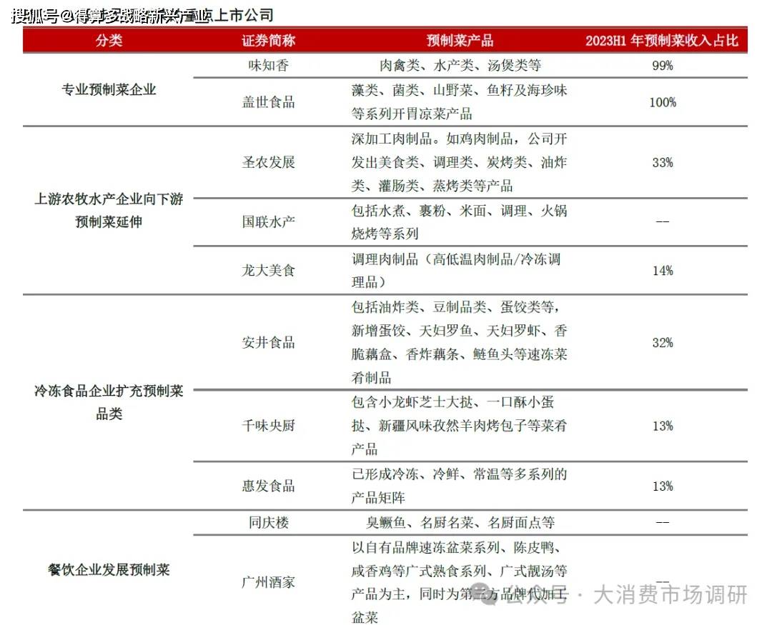 目前涉足預(yù)制菜的上市公司較多。A股涉足預(yù)制菜的上市公司主要有以下幾類:專注預(yù)制菜領(lǐng)域的企業(yè),以味知香和蓋世食品等為代表;上游農(nóng)牧水產(chǎn)企業(yè)向下游預(yù)制菜延伸,以圣農(nóng)發(fā)展、國聯(lián)水產(chǎn)等為代表的;冷凍食品企業(yè)拓寬預(yù)制菜產(chǎn)品線,以安井食品、千味央廚等為代表的;餐飲企業(yè)拓展預(yù)制菜,以同慶樓、廣州酒家等為代表。