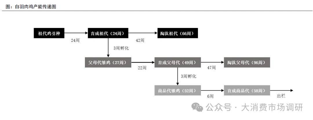 從祖代白羽肉種雞引種到第一批商品代白羽肉雞出欄的時(shí)間通常為58周左右。白羽肉雞從祖代白羽肉種雞引種到首次產(chǎn)蛋的時(shí)間通常為24周,父母代種蛋經(jīng)過(guò)3周孵化即可育得首批父母代白羽肉雛雞,經(jīng)過(guò)22周育雛便可產(chǎn)得首批商品代種蛋,此后經(jīng)過(guò)3周孵化和6周養(yǎng)殖即可實(shí)現(xiàn)首批商品代白羽肉雞出欄,因此從祖代白羽肉種雞引種到第一批商品代白羽肉雞出欄的時(shí)間通常為58周左右。