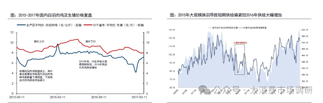 (2015年10月-2017年2月):本輪周期的上行階段主要由產(chǎn)能調(diào)減和豬價(jià)反轉(zhuǎn)共同驅(qū)動(dòng)。2014年白羽肉雞聯(lián)盟成立,祖代更新量迎來(lái)拐點(diǎn),此后美國(guó)、法國(guó)等地相繼出現(xiàn)禽流感暴發(fā),國(guó)內(nèi)祖代白羽肉種雞更新嚴(yán)重受阻,疊加生豬價(jià)格反轉(zhuǎn)帶來(lái)的支撐,白羽肉雞價(jià)格在2015年10月開(kāi)啟上行走勢(shì)。然后由于種雞養(yǎng)殖企業(yè)針對(duì)未來(lái)引種收縮進(jìn)行了大規(guī)模換羽,導(dǎo)致2016年行業(yè)整體產(chǎn)能回彈明顯,疊加豬價(jià)下行,白羽肉雞價(jià)格持續(xù)下行。