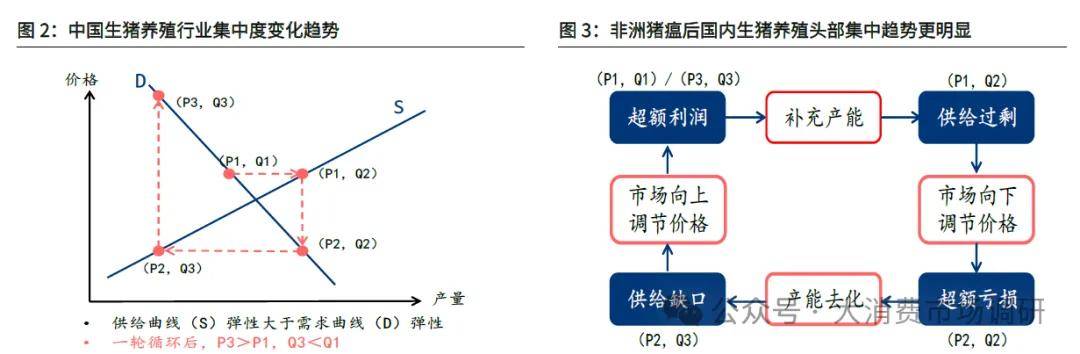 生豬行業(yè)具有周期性和成長性的雙重特征。其中,周期性源自盈利波動(dòng),豬周期與發(fā)散型蛛網(wǎng)模型相吻合,在需求相對平穩(wěn)(雖有年度淡旺季之分)的背景下,研究價(jià)格波動(dòng)的關(guān)鍵在于供給端。生豬行業(yè)的供給影響因素主要包括壓欄(二次育肥)、收放儲(chǔ)、豬肉進(jìn)口、能繁母豬存欄(淘汰、補(bǔ)欄),其中能繁母豬存欄是核心影響因素。供給與價(jià)格之間的關(guān)系,如同蛛網(wǎng)模型所描述的那樣,盈利的變化引起產(chǎn)能的波動(dòng),而產(chǎn)能的波動(dòng)又反過來影響盈利,形成一個(gè)循環(huán)往復(fù)的過程。在觀察豬周期時(shí),我們主要聚焦于兩個(gè)核心點(diǎn):周期的高度和長度。周期的高度,主要受到產(chǎn)能去化幅度的影響;而周期的長度,則是由豬的生產(chǎn)周期所決定的。自2003 年以來,國內(nèi)豬價(jià)經(jīng)歷了五次明顯的豬周期,特別是近年來,其波動(dòng)幅度顯著增強(qiáng),尤其是下行周期的波動(dòng)更為劇烈。