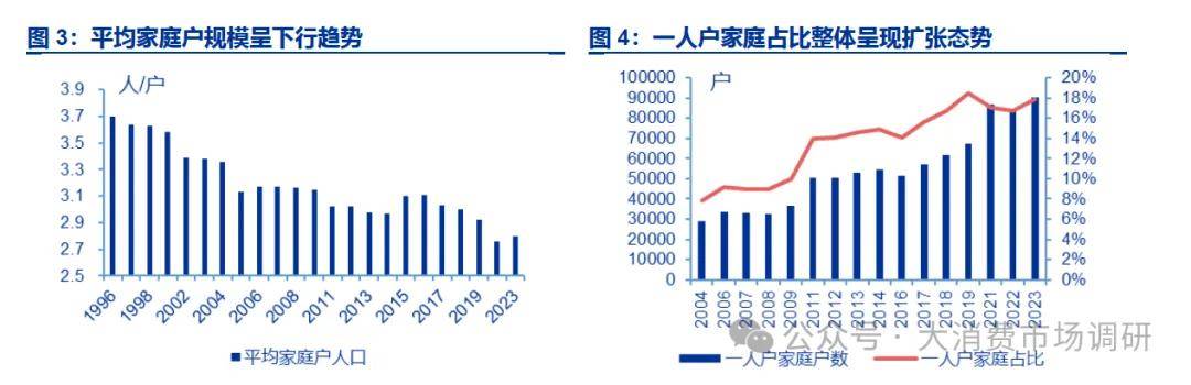 我國社會環(huán)境不斷變化,推動家庭結(jié)構(gòu)和消費(fèi)行為深刻轉(zhuǎn)變。據(jù)國家統(tǒng)計(jì)局,我國平均家庭戶規(guī)模近30 年來波動下行,從1996 年的3.7 人/戶顯著下降到2023 年的2.8 人/戶。一人戶家庭規(guī)模也呈持續(xù)擴(kuò)大趨勢,一人戶家庭占比于23 年達(dá)17.8%,較04 年占比翻倍。