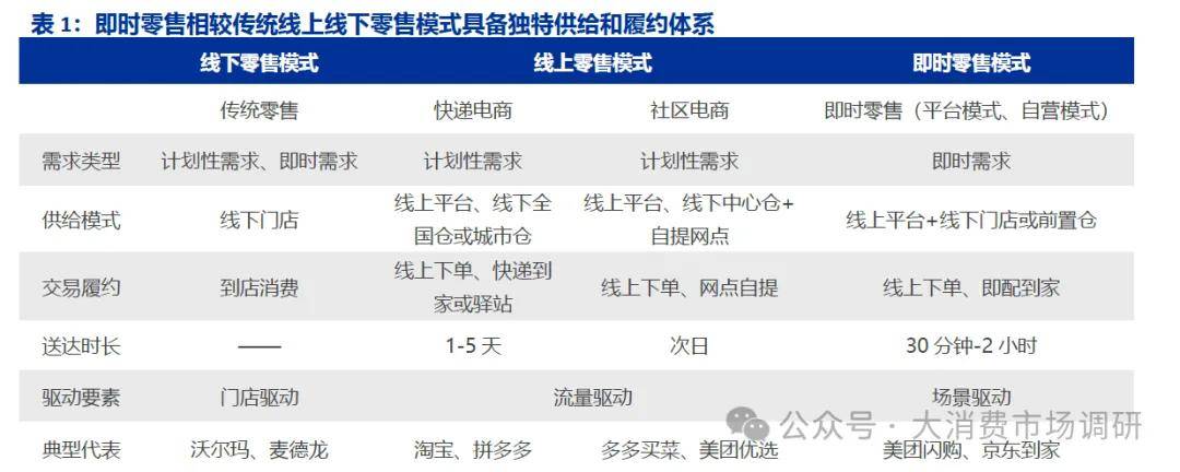 根據(jù)消費(fèi)第一性原理,即時零售通過精準(zhǔn)鎖定“即時需求”場景,構(gòu)建了獨(dú)特的供給與履約體系。即時零售是以“線上即時下單、線下即時履約”為核心模式,依托本地零售供給,精準(zhǔn)聚焦本地消費(fèi)者“便利化、即時性消費(fèi)需求”的新型消費(fèi)模式。據(jù)商務(wù)部研究院和奧緯咨詢,在需求端,即時零售以“30 分鐘至2 小時送達(dá)”的時效標(biāo)準(zhǔn),顯著區(qū)別于快遞電商的1-5 天、社區(qū)電商的次日達(dá)模式,直擊消費(fèi)者對緊急性、便利性需求的核心痛點(diǎn)。在供給端,即時零售依托本地線下門店或前置倉布局,實(shí)現(xiàn)了“線上平臺下單+線下即配到家”的閉環(huán),既避免了傳統(tǒng)電商的長鏈路,又突破了社區(qū)電商依賴自提網(wǎng)點(diǎn)的服務(wù)限制。這種“需求-供給-履約”的高效協(xié)同,使即時零售在快消品、生鮮等高時效敏感品類中形成顯著壁壘,成為新零售業(yè)態(tài)迭代的重要方向。