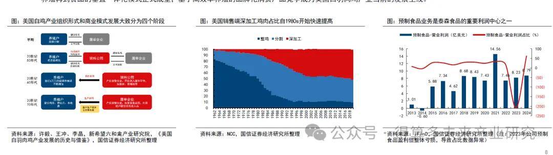 (2000s-至今)基于高效率養(yǎng)殖的品牌化食品業(yè)務(wù)快速發(fā)展:進(jìn)入21世紀(jì)后,為進(jìn)一步尋求價(jià)值端突破,頭部屠宰企業(yè)開始向下游食品加工拓展,從原料到養(yǎng)殖再到食品的垂直一體化模式正式成型,基于高效率養(yǎng)殖的品牌化消費(fèi)產(chǎn)品競(jìng)爭(zhēng)成為美國白羽肉雞產(chǎn)業(yè)當(dāng)前的發(fā)展主線。
