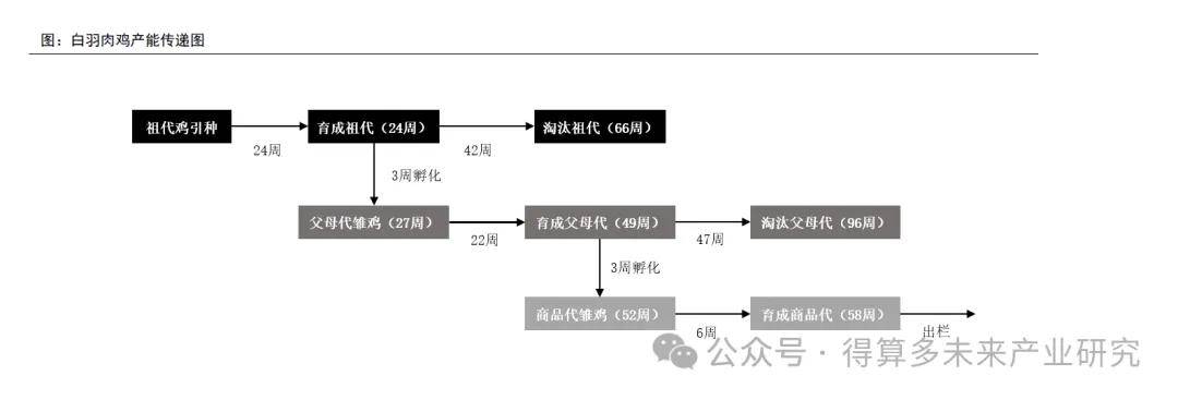 不考慮強(qiáng)制換羽操作,從祖代白羽肉種雞引種到最后一批商品代白羽肉雞出欄的時(shí)間為147周左右。祖代白羽肉種雞產(chǎn)蛋期通常為42周,期間可以擴(kuò)繁約60套父母代白羽肉種雞,父母代白羽肉種雞的產(chǎn)蛋期通常為47周,期間可以繁育約120羽商品代白羽肉雞,所以每套祖代白羽肉種雞可以累計(jì)繁育約7200羽商品代白羽肉雞,即擴(kuò)繁系數(shù)為1:7200。