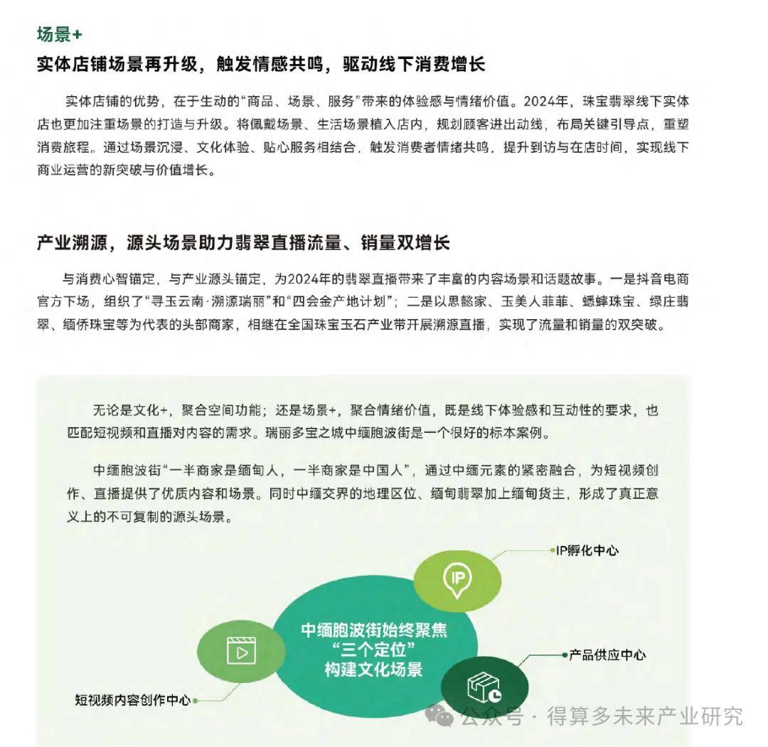 千億級(jí)玉器珠寶產(chǎn)業(yè)集群,推動(dòng)珠寶玉石產(chǎn)業(yè)集約化發(fā)展在珠寶產(chǎn)業(yè)規(guī)模持續(xù)擴(kuò)大的浪潮下,以平洲、番禺為代表的產(chǎn)業(yè)帶積極借助移動(dòng)互聯(lián)、大數(shù)據(jù)、人工智能、區(qū)塊鏈等數(shù)字生產(chǎn)力,全力打造集研發(fā)設(shè)計(jì)、珠寶加工、鑒定評(píng)估、保稅倉儲(chǔ)、物流配送、展示交易、跨境電商、文化旅游于一體的千億級(jí)現(xiàn)代化產(chǎn)業(yè)園區(qū),推動(dòng)珠寶玉石產(chǎn)業(yè)集約化發(fā)展。通過構(gòu)建沉浸式體驗(yàn)場(chǎng)景和多業(yè)態(tài)的資源整合,在實(shí)現(xiàn)產(chǎn)業(yè)升級(jí)的基礎(chǔ)上,驅(qū)動(dòng)線下文旅消費(fèi)市場(chǎng),形成珠寶產(chǎn)業(yè)與文旅消費(fèi)的深度互融,推動(dòng)珠寶玉石產(chǎn)業(yè)的長效發(fā)展。